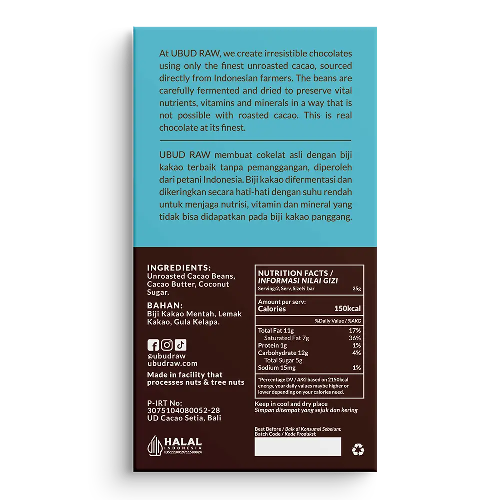 This dark chocolate is made using only premium unroasted beans from Bali, Papua, and Sulawesi. These beans are what we call volcanic beans. Sweetened only with coconut blossom sugar.